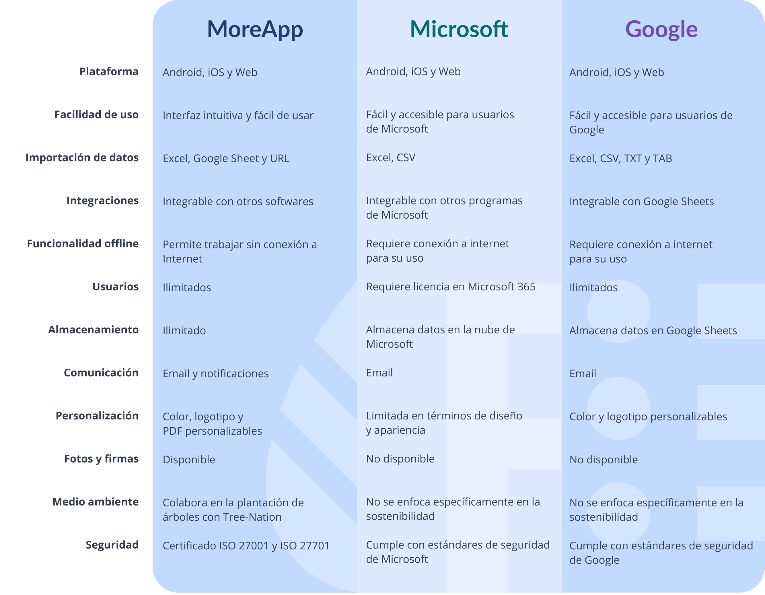 Estos formularios son muy fáciles de utilizar y permiten recopilar datos de manera más rápida. No obstante, hay muchas plataformas disponibles y es normal que surjan dudas sobre cuál es la que encaja mejor con cada empresa y sus necesidades de trabajo. Por esta razón, en este blog te presentaremos una comparativa entre tres de estas plataformas: Formularios de Google, Formularios de Microsoft y los Formularios Digitales de MoreApp.