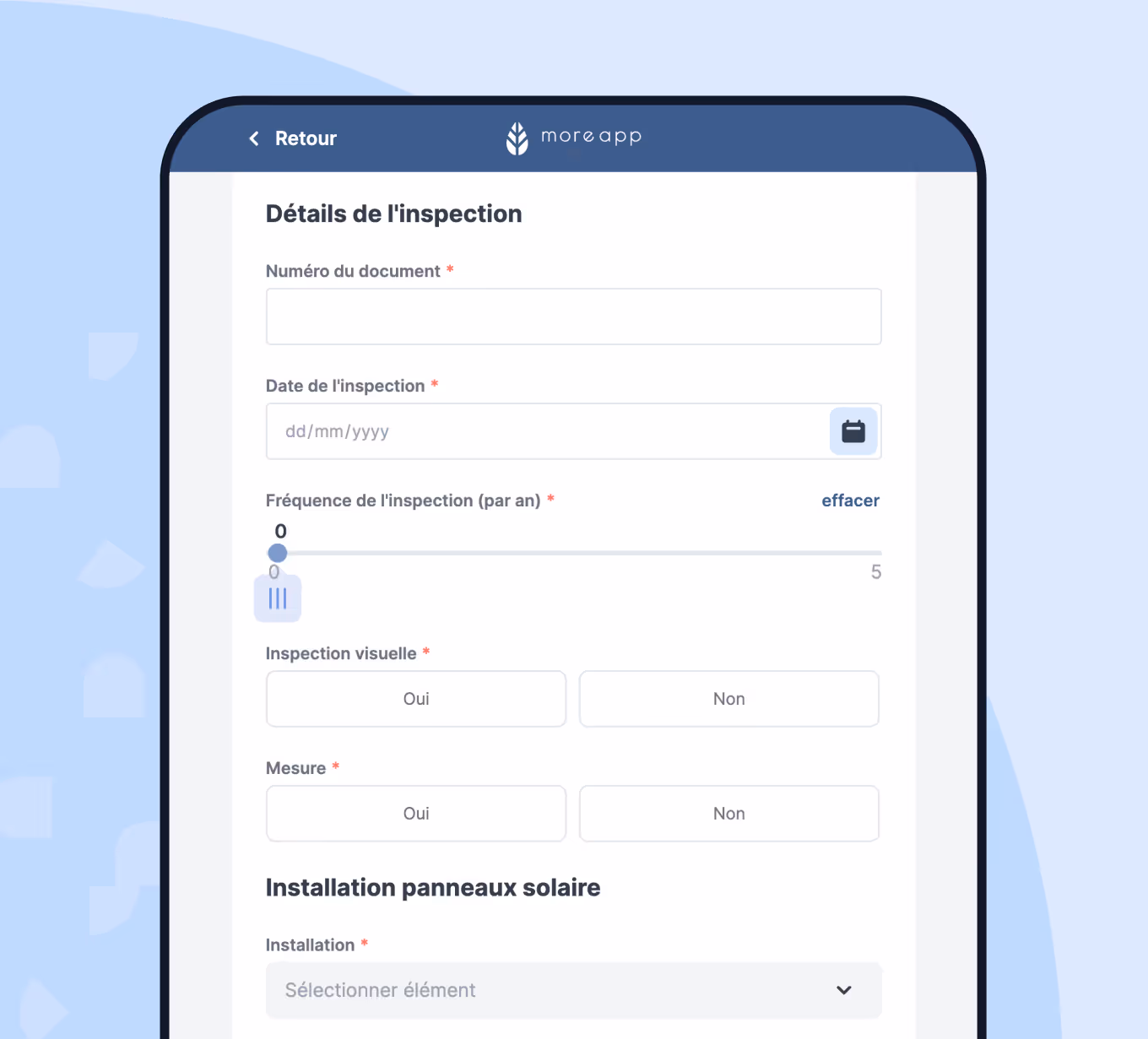 Les audits de sécurité jouent un rôle crucial pour garantir la sécurité du travail avec les panneaux solaires. Ces audits permettent de vérifier que les installations sont conformes aux règles de sécurité et d'identifier les risques potentiels. Avec MoreApp, vous créez facilement vos inspections et rapports numériques en un clin d'œil, assurant la conformité avec toutes les règles de sécurité. Le respect des règles de sécurité est essentiel pour prévenir les accidents et garantir la sécurité à long terme. Si des lacunes sont constatées lors d'une inspection, il est important d'y remédier le plus rapidement possible.